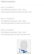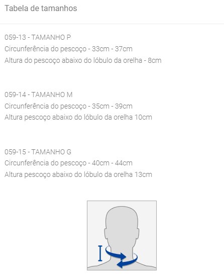 R: Meça a circunferência do pescoço e a altura abaixo do lóbulo da orelha, e compare com as medidas fornecidas na tabela de tamanhos para escolher o tamanho adequado.