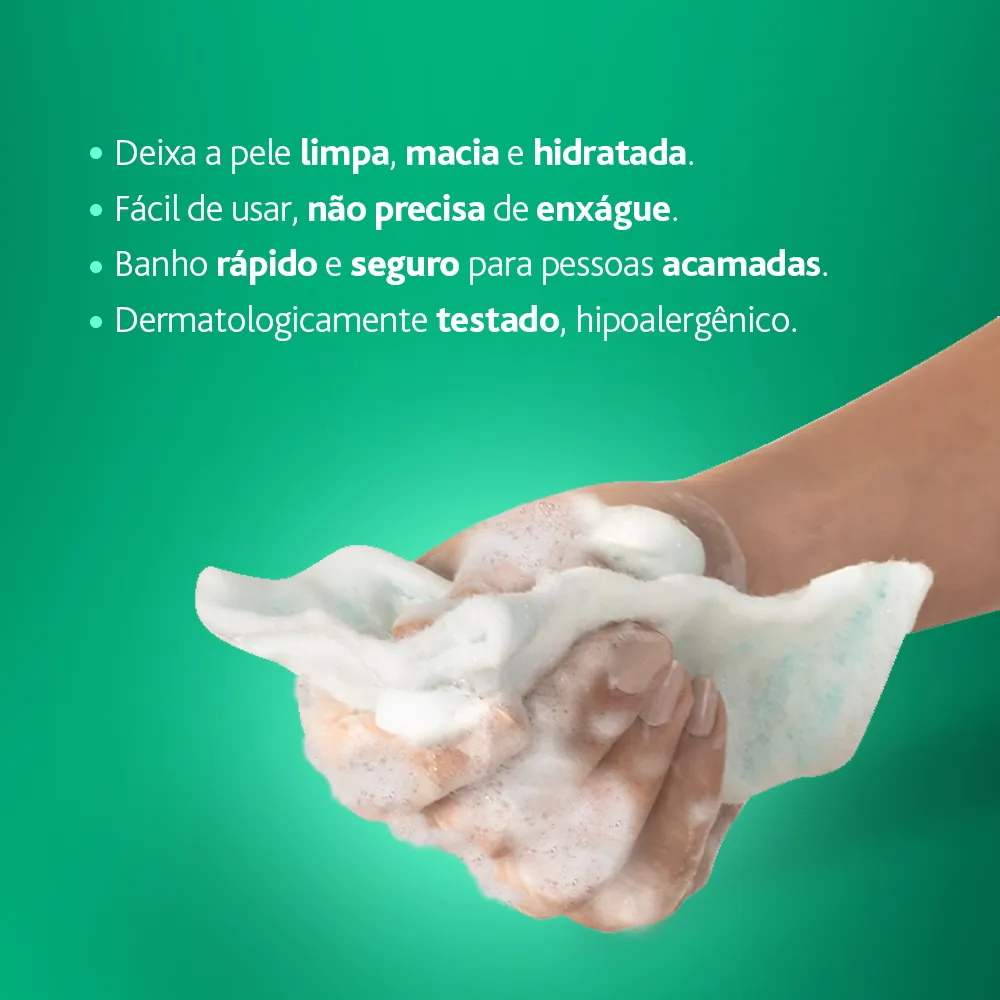 - Banho Prático e Rápido: Higiene completa sem necessidade de água e enxágue.