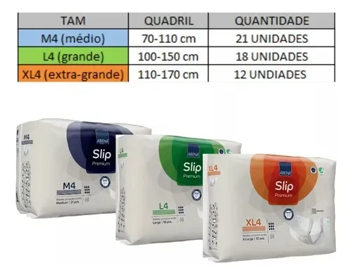 Quantidade por pacote M4: 21 unid / L4: 18 unid / XL4: 12 unid