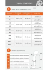 | Tabela de medidas P (Curta) | Tornozelo: 19-23 cm | Panturrilha: 30-38 cm | Altura: até 39 cm |