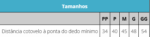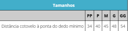 | Tamanho PP | Até 34 cm (cotovelo à ponta do dedo mínimo) |